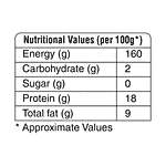 Nutrition per gram: 100g Energy (g): 160 g Carbohydrate (g): 0 g Sugar (g): 0 g Protein (g): 18 g Total fat (g): 0 g