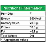 Per 100g * Energy 550 Kcal Carbohydrates 23.3 g Protein 18.3 g Fat 46.7 g Total Sugars 0 g