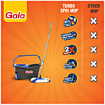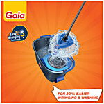Gala Turbo Spin Mop with patented Turbo Clean Fibers that helps remove over 99% bacteria with water. Unlike Regular spin mop head, Gala triangular mop head can reach and clean every corner effortlessly. Comes with sturdy big wheels and easy puller handle that makes the movement of the bucket effortless modern technology friction-free wringer and washer reduces the efforts required for wringing and washing by over 20%. Extendable rubberized gala long handle rod helps to clean without bending.