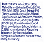 Wheat Flour (Atta), Malted Barley (Extracted Solids) (25%), Milk Solids (22%), Cereal Extract (8%) [Barley, Malted Barley, Millet, Wheat], Sugar, Minerals, Wheat Gluten, Vitamins, Edible Iodised Salt, Acidity Regulator [INS 501(ii)], Docosahexaenoic Acid (DHA) Powder from Schizochytrium sp. (0.26%), Nature Identical Flavouring Substance, Soy Protein Isolate.