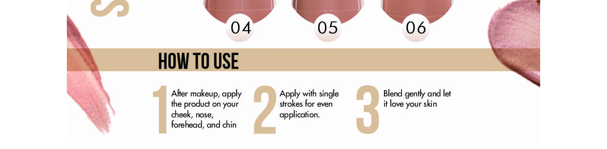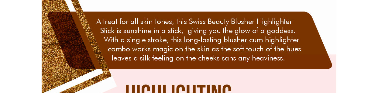 Get the natural glowing skin with Swiss Beauty insta glow highlighter stick. Use it on your cheekbones, forehead and high point of your face, so that when your face hits the light, you get a nice shimmery glow.