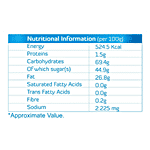 Nutrition per gram/ml: 100g Energy: 524.5 Kcal Proteins: 1.5g Carbohydrates: 69.4g Of which sugar(s): 44.9g Fat: 26.8g Saturated Fatty Acids: 0.0g Trans Fatty Acids: 0.0g Fibre: 0.2g Sodium: 2.225 mg