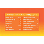 Nutrition per gram/ml: 100g Energy (kcal): 900 kcal Mono Unsaturated Fatty Acids (g): 41 g Poly Unsaturated Fatty Acids (g): 45 g Saturated Fatty Acids (g): 14 g Trans Fatty Acids (g): 0 g Carbohydrate (g): 0 g Sugar (g): 0 g Protein (g): 0 g Fat (g): 100 g Cholesterol (mg): 0 mg Vitamin E (mg): 29.5 mg