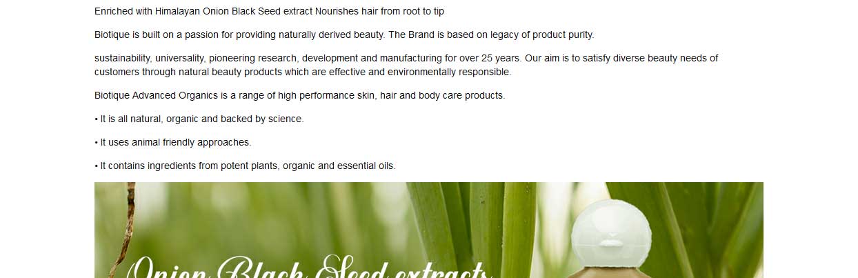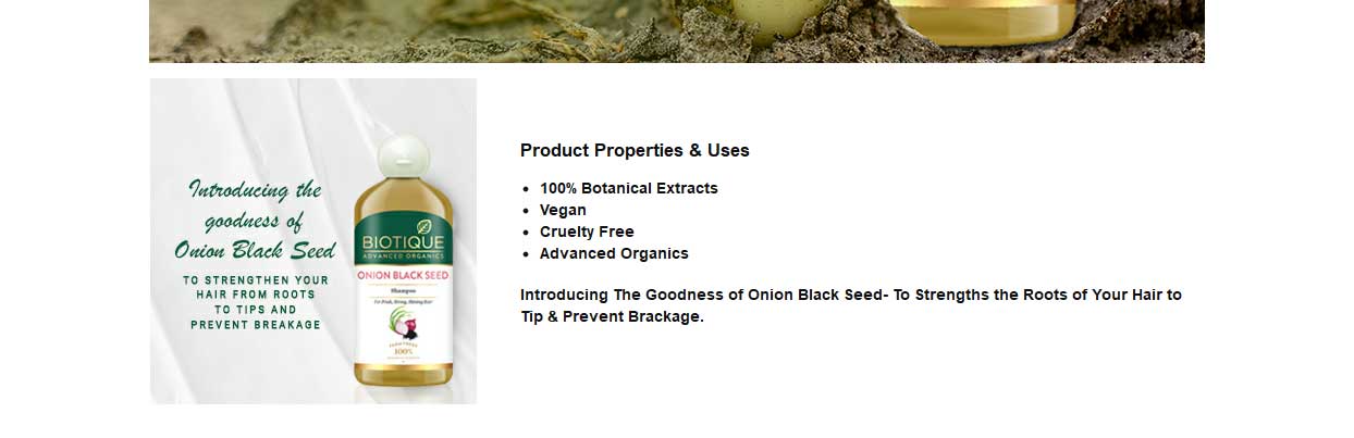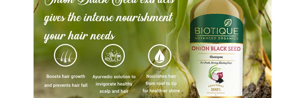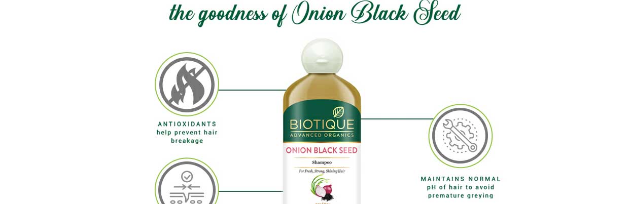 About the product Biotique Onion Black Seed Shampoo is enriched with Himalayan onion black seed extract. It reduces hair fall and breakage, boosts healthy growth and shine. The antioxidants help prevent hair breakage. It hydrates your hair cuticles, strengthens and adds shine. It maintains the pH level of your hair, preventing it from premature greying. This oil boosts hair growth and nourishes it from the roots to tip.Only customers who purchase this product from bigbasket can rate and review