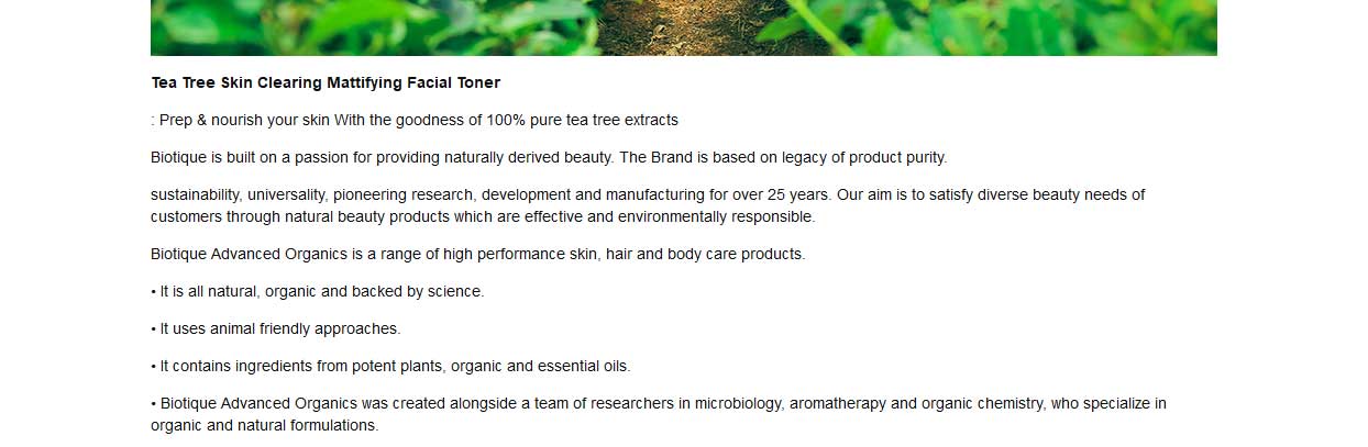 Biotique Tea Tree Face Toner is enriched with the goodness of 100% pure tea tree extract. It washes away excess oil and impurities. It detoxifies and purifies without irritating your skin. The anti-inflammatory properties soothe and heal your skin. It has anti-bacterial properties keep away acne forming bacteria. It is made with all pure ingredients and is preservative-free.