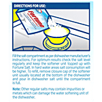 Fortune Salt makes the detergent work more effectively by making the water soft. Hard water can also block the washer jets with lime scale and cause deposits on heating elements which can reduce the cleaning efficiency, increase the electricity costs and shorten the life of the machine. Fortune Salt is specially formulated to avoid clogging, regular use will ensure effective water softening to give the best possible results.