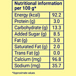 Energy(kcal)-92.2, Protein(g)-3.0, Carbohydrate(g)-13.3, Added Sugar(g),8.5, Fat(g)3.0, Saturated Fat(g)2.0, Transfat(g)0.0, Calcium(mg):96.8, Sodium(mg)-35.7