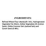 Refined Wheat Flour (Maida) (81.16%), Hydrogenated Vegetable Fat (Palm), Edible Vegetables Oil (Cotton Seed), Edible Common Salt (Iodised Salt) and Carom Seed (0.48%).