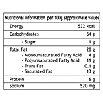 Energy 532 kcal Carbohydrates 54 g - Sugar 1 g Total Fat 28 g - Monounsaturated Fatty Acid 4 g - Polyunsaturated Fatty Acid 11 g - Trans Fat 0.1 g - Saturated Fat 13 g Protein 6 g Sodium 520 mg