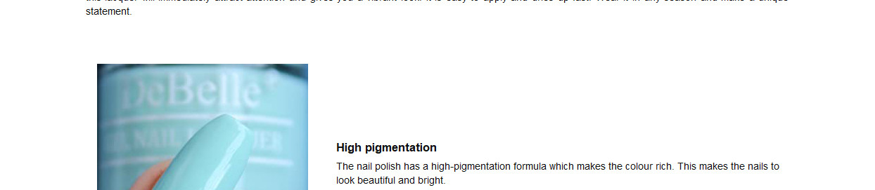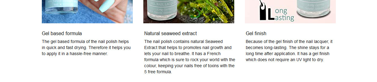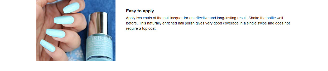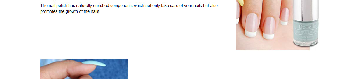 Nail your nail game with DeBelle’s naturally enriched range of Gel Nail Lacquer.It gives a rich salon shine finish with good staying power and gives a very rich and elegant nails. Enriched with anti-oxidant rich seaweed extract, this gel nail polish helps to promote nail growth and to maintain healthy nails by preventing yellowing of nails. DeBelle nail polish is a long lasting, rich colour pay off, French formula. It’s cruelty free & halal certified nail polish. It has an easy to use flat brush that helps to cover the full nail with ease.