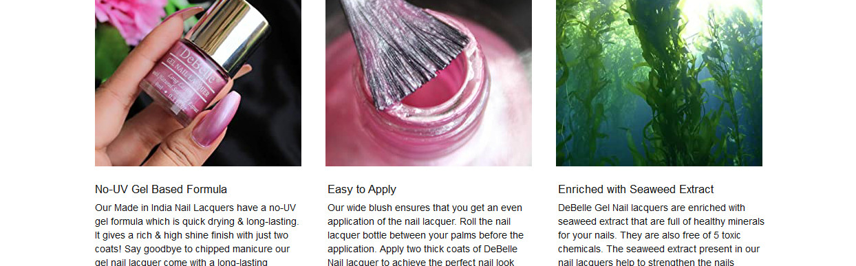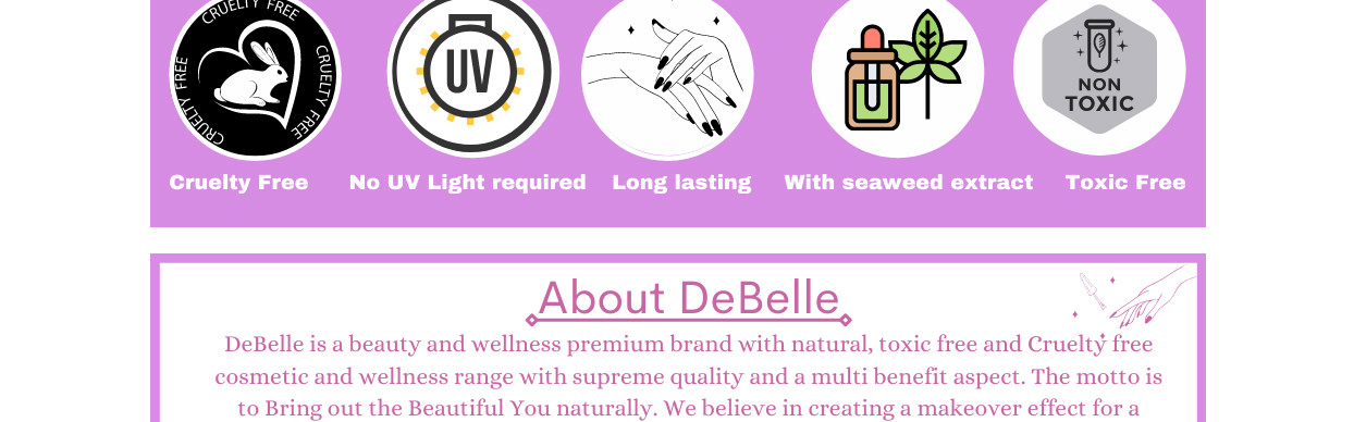 Nail your nail game with DeBelle’s naturally enriched range of Gel Nail Lacquer.It gives a rich salon shine finish with good staying power and gives a very rich and elegant nails. Enriched with anti-oxidant rich seaweed extract, this gel nail polish helps to promote nail growth and to maintain healthy nails by preventing yellowing of nails. DeBelle nail polish is a long lasting, rich colour pay off, French formula. It’s cruelty free & halal certified nail polish. It has an easy to use flat brush that helps to cover the full nail with ease.
