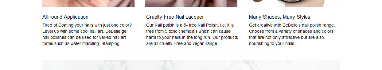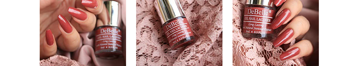 DeBelle Gel Nail Lacquer comes in latest trendy shades that can complement any office wear, daily wear or occasion wear. DeBelle nail polishes can be used in various nail art concepts. This Gel Nail Polish dries naturally. Paint away with 5 free Gel Nail Lacquer free from toxic chemicals. Get your professional manicure/pedicure right at the comfort of your home with DeBelle range of Gel Nail Lacquer.