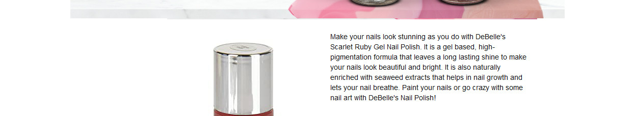 Nail your nail game with DeBelle’s naturally enriched range of Gel Nail Lacquer. Scarlet Ruby this Pastel Burgundy shade is a beautiful crème finish nail polish shade that can enhance the beauty of your overall look. It gives a rich salon shine finish with good staying power and gives a very rich and elegant nails. Enriched with antioxidant rich seaweed extract, this gel nail polish helps to promote nail growth and to maintain healthy nails by preventing yellowing of nails. DeBelle nail polish is a long lasting, rich colour pay off, French formula. It’s cruelty free & halal certified nail polish. It has an easy to use flat brush that helps to cover the full nail with ease.