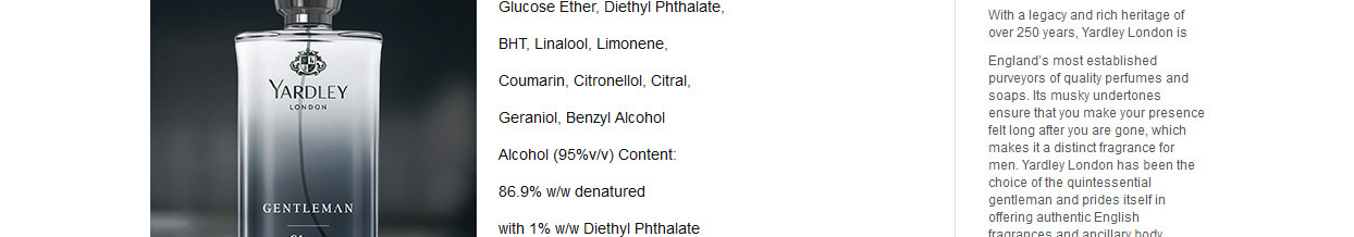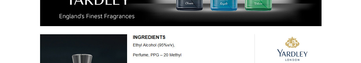 Ethyl Alcohol (95%V/V), Perfume, PPG – 20 Methyl Glucose Ether, Diethyl Phthalate, BHT, Linalool, Limonene, Coumarin, Citronellol, Citral, Geraniol, Benzyl Alcohol Alcohol (95%V/V) Content: 86.9% W/W Denatured With 1% W/W Diethyl Phthalate