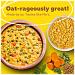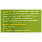 70% Oats, Vegetables 9% (Onion, Peas, Methi, Curry Leaves, Carrot), 7% Seeds (Watermelon, Pumpkin, Chia), Seasoning (Toor Dal, Powders (Green Chilli, Onion, Tomato, Ginger, Garlic, Turmeric, Cinnamon, Clove, Bayleaf, Nutmeg, Mace, Coriander, Asafoetida, Cumin), Fenugreek Leaves, Salt, Ghee), Rice Bran Oil.