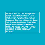 70% Oats, 9% Vegetables (Onion, Peas, Methi, Carrot), 7% Seeds (Watermelon, Pumpkin, Chia), Natural Seasoning (Skimmed Milk Powder, Sugar, Salt, Oregano, Basil Leaves, Onion, Black Pepper, Chilli Powder), Rice Bran Oil. Added Natural Flavors (Cheddar Cheese, Rosemary Extract.