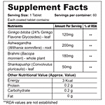 Ashwagandha (Withania Somnifera): 200mg, Brahmi (Bacopa Monnieri): 180mg, Ginkgo Biloba: 120mg, Shankapushpi (Convolvulus Pluricaulis): 50mg
