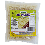 Royal 2D Potato Papad is a snack composed of potato starch and rock salt. It can also be taken during fasting in Navratri. It puffs when deep fried and tastes delicious. The potatoes are boiled ,peeled and mashed to make a fine potato dough. These potato papad are shaped into a penne that is cylinder-shaped pieces. They make a great snack. Papad is good appetizer and digestive. It tastes delicious because of its crispiness. It is great accompanied with Indian meals.