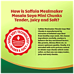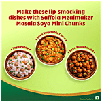 It is High in Protein - 53%, High in Fibre - 13% & Low in Fat (Nutritive value of Foods ICMR, JFST), which aids your Family's nutrition thanks to the goodness of protein and fibre and adds great taste to their everyday food with the tender & juicy soya chunks. Chilli Soya, Soya Aloo curry, Soya Mutter & Soya Biryani are some of the dishes that will taste good with Saffola Mealmaker Soya Chunks. Now every soya dish will be delicious. Try Saffola Mealmaker Soya Chunks -Tasty Super Soft, Soya Chunks. Soya chunk is also known as soya wadi, soya nuggets, soya badi, soyabean badi.
