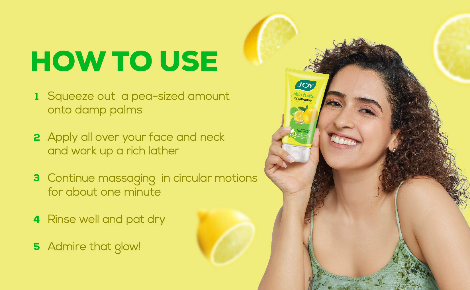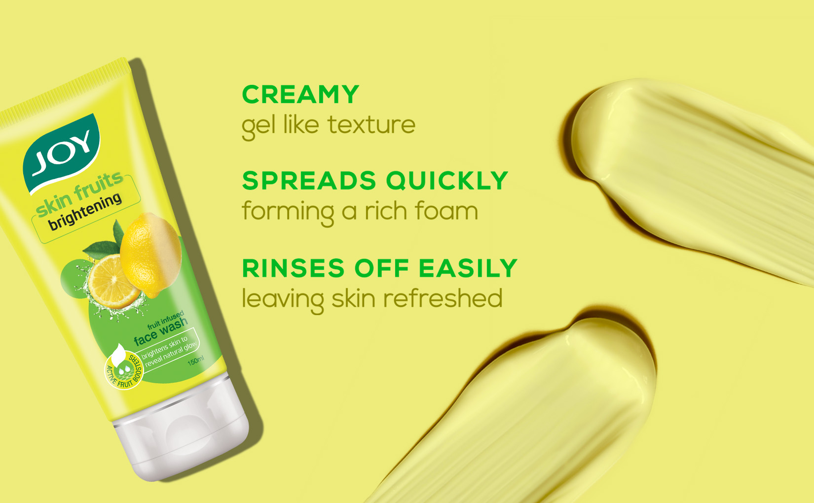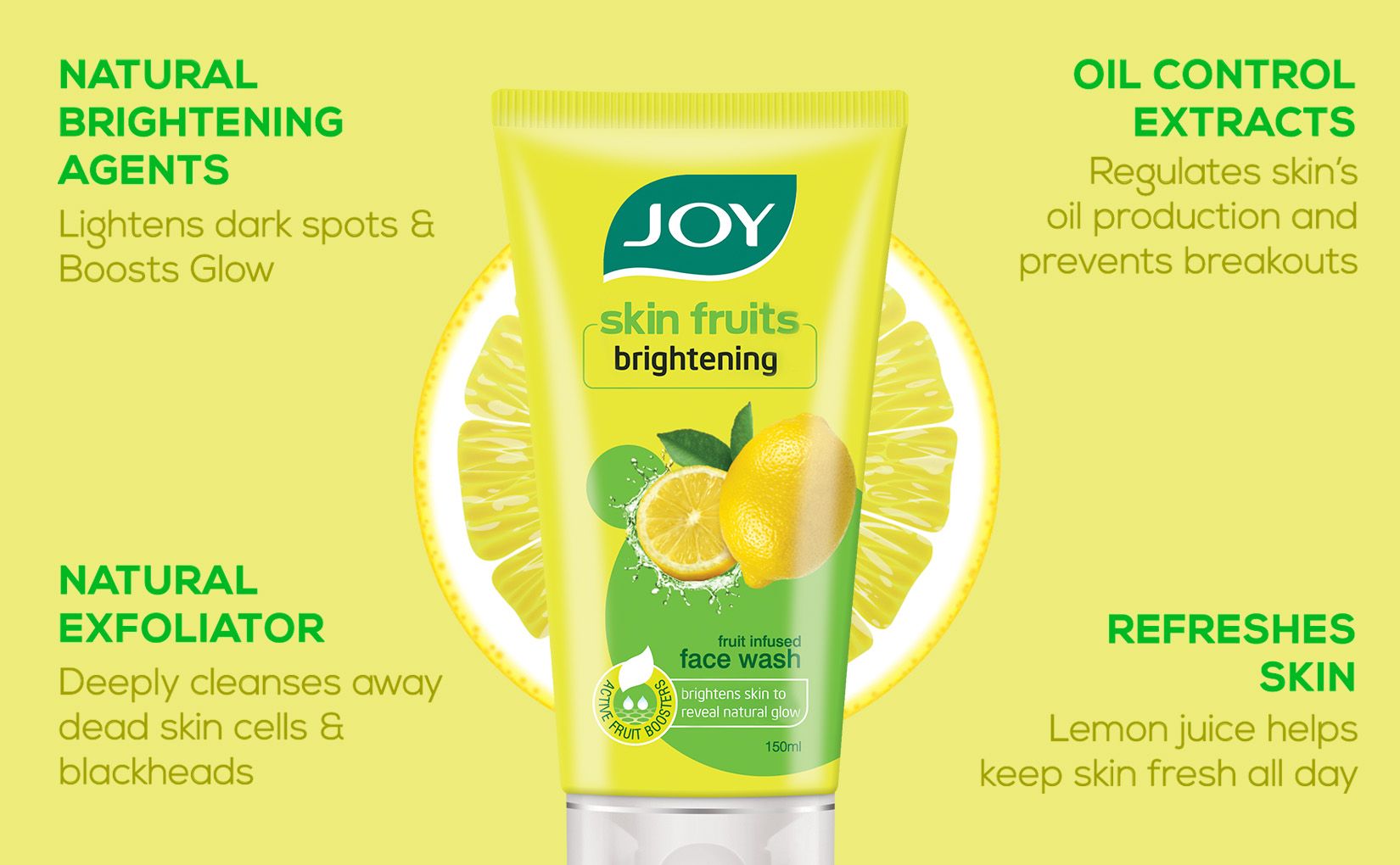 This Joy face wash contains Lemon Extracts and Active Fruit Boosters, which fight unwanted blemishes revealing the natural brightness of the skin. Lemon is an excellent addition to the skincare regime because citric acids help in clearing the skin of blemishes and marks. Joy Skin Fruits Brightening Face Wash absorbs excess oils and clears pores without taking away skin’s natural oil balance & removes dead cells. Lemon is a natural skin-lightening agent which freshens and brightens skin. Rich in Vitamin C, Vitamin B and citrus fruit acids, it reveals the natural glow of the skin. Fruit acids gently clean impurities, and lighten spots, freckles and pigmentation.