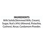 Milk Solids (Skimmed Milk, Cream), Sugar, Nut's (4%)(Almond, Pistachio, Cashew), Kesar, Cardamom Powder