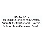 Milk Solids (Skimmed Milk, Cream), Sugar, Nut's (4%) (Almond, Pistachio, Cashew), Kesar, Cardamom Powder