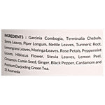 Garcinia Combogia, Terminalia Chebula, Senna Leaves, Piper Longum, Nettle Leaves, Turmeric Root, Lemongrass Leaves, Moringa Leaves, Rose Petals, Peppermint Leaves, Hibiscus Flower, Stevia Leaves, Lemon Peel, Cinnamon, Cumin Seed, Ginger, Black Pepper, Cardamom and Premium Darjeeling Green Tea. 21 Ayurveda