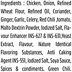 Chicken, Onion, Refined Wheat Flour, Refined Oil, Coriander, Ginger, Garlic, Celery, Red Chili, Tomato, Malto Dextrin Powder, Iodized Salt, Flavour Enhancer INS-627 & INS-631, Yeast Extract, Flavour, Nature Identical Flavoring Substances, Anti Caking Agent INS-551, Iodized Salt, Soya Sauce, Spices & condiments, Green Chili.