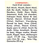 Kali Mirch (Piper Nigrum), Nisoth (Operculina Turpethum), Danti Mool (Boliospermum Montanum), Devdaru (Cedrus Deodara), Gobar Ka Ras, Haldi (Curcuma Longa), Daru Haldi (Berberis Aristata), Jatamansi (Nardostachys Jatamansi), Kuth (Saussurea Lappa), Lal Chandan (Pterocarpus Santalinus), Indrayan Mool (Citrullus Colocynthis), Karanj Ki Jad (Caesalpinia Bonducella Fleming), Chitrak Mool Chhal (Plumbago Zeylanica), Kalihari (Gloriosa Superba), Viavidang (Embelia Ribes), Neem Chhal (Azadirachta Indica), Giloy (Tinospora Cordifolia), Amaltash (Cassia Fistula), Nagar Motha (Cyperus Scariosus), Pippal (Piper Longum), Vach (Acorus Calamus), Tela (Mustard Oil) (Brassica Campestris Var. Sarson), Gomutra And Other Prominent Herbs
