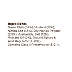 Green Chilli, Mustard, Nimbu Salt, Dry Mango Powder, Asafoetida, Salt, Mustard Oil, Ground Spices & Acid Regulator