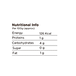 Nutrition_per: 100g Energy: 126 Kcal Proteins: 1g Carbohydrates: 4 g Sugar: 0g Fat: 1g
