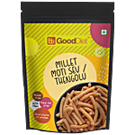 Calling all South Indian snack lovers. BigBasket brings to you a fresh take on a traditional snack with GoodDiet Millet Moti Sev / Thengolu. Made with 44% millets, this gluten-free snack is a bag of flavours that take you on a nostalgic journey. Pair this crunchy goodness with a side of piping hot chai or just have it on its own, and watch as it quickly becomes a family favourite. Indulge in this healthy snack, guilt-free! GoodDiet brings you a yummy collection of savoury namkeens and snacks that you and your family are sure to enjoy without all the calorie stress.