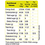 Nutrition per gram/ml: 100g Serving Size: 30g Energy (kcal): 578.94 Carbohydrate (g): 44.64 Total sugar (g): 0.5 Added sugar (g): 0 Dietary fibre (g): 2.98 Protein (g): 13.29 Total fat (g): 38.58 Trans fat (g): 0 Saturated fat (g): 17.86 Cholesterol (mg): 0 Sodium (mg): 400