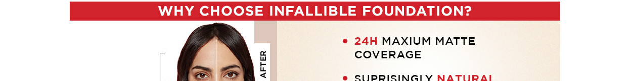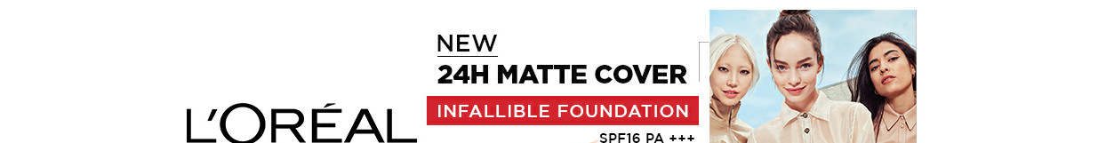 Loreal Paris - Feel Infallible Everyday! The LOreal Paris Infallible 24H Matte Cover Foundation is a long-lasting liquid foundation and a true oily-skin savior! Guarantees all-day maximum matte coverage with shine control! Have we mentioned that the L'Oreal Paris Infallible 24H Matte Cover Foundation is also Transfer-proof, Waterproof and Heatproof! 24H Oil-Control, 24H Shine-Control: L'Oreal Paris Infallible 24H Matte Cover Foundation is powered with duo oil-control ingredients; Instantly absorbs sebum & ensures an all-day matte coverage. Transfer-proof: L'Oreal Paris Infallible 24H Matte Cover Foundation simply leaves no traces, even when wearing a face mask. Waterproof, Sweatproof and Heatproof: No fear of smudges! The L'Oreal Paris Infallible 24H Matte Cover Foundation is a breathable, ultra-lightweight texture liquid foundation, with a natural matte finish. Now available in 16 shades How to apply foundation flawlessly: Shake the L'Oreal Paris Infallible 24H Matte Cover Foundation well before use. Dot this waterproof foundation onto cheeks, nose, chin, and forehead. Using fingers, brush or a makeup sponge, blend foundation out towards hairline and down.