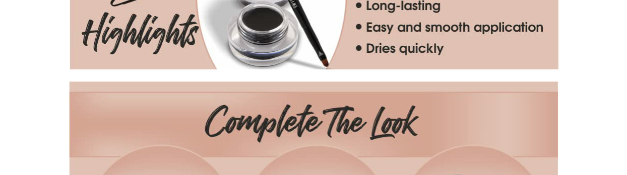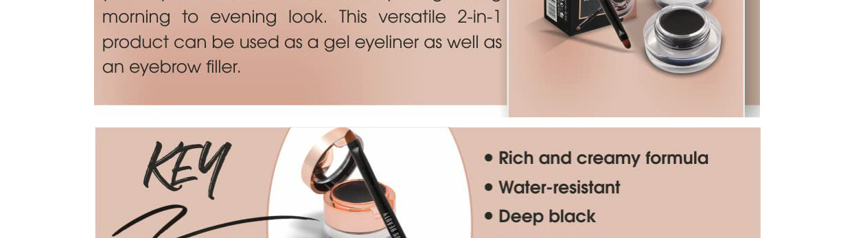 This eyebrow & gel eyeliner has a rich and creamy water-resistant formula that glides on smooth without smearing or smudging for long-lasting, all-day wear. It comes with a professional fine eyeliner brush that expertly defines eyes to create texture so it spreads evenly. The formula goes on smooth with a deeply saturated colour that lasts all day. It's quick-drying and doesn't flake.
