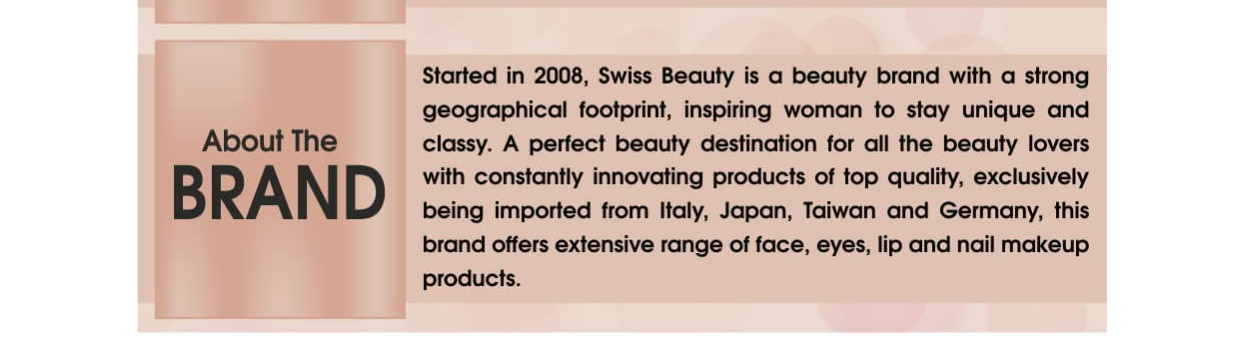 Imported & Marketed by: Swiss Beauty: 150, 2Nd Floor, New Qutab Road, Sadar Bazar, Delhi-110006