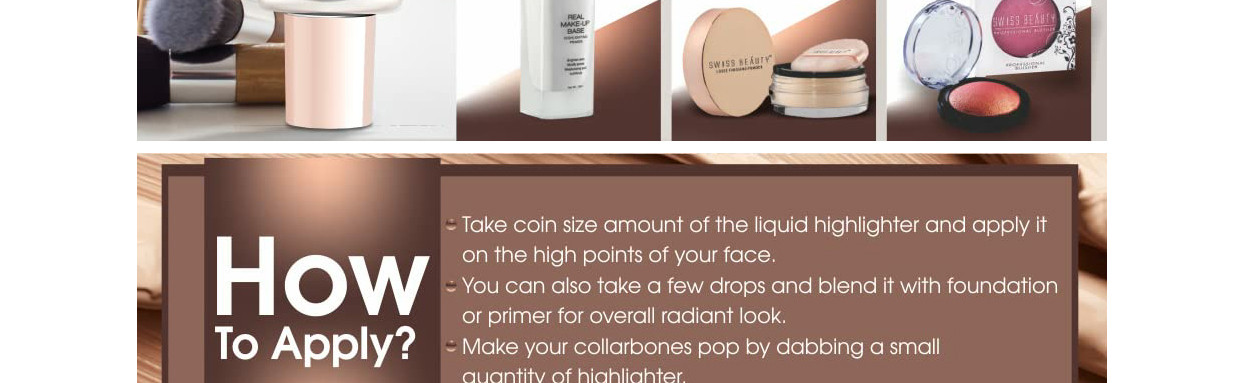 After applying foundation. Dot the liquid along with the areas of the face that are naturally hit by the sun, the top of cheekbone, nose, or mix with foundation for vibrant makeup.