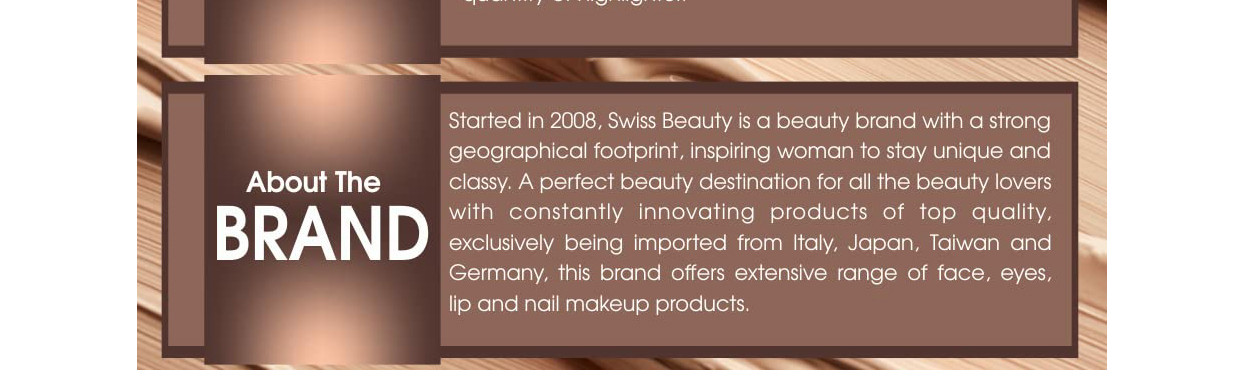 Imported & Marketed by: Swiss Beauty: 150, 2Nd Floor, New Qutab Road, Sadar Bazar, Delhi-110006