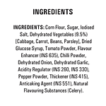 Corn Flour, Sugar, Iodised Salt, Dehydrated Vegetables (9.5%) [Cabbage, Carrot, Beans, Parsley], Dried Glucose Syrup, Tomato Powder, Dehydrated Garlic, Dehydrated Onion, Flavour Enhancer (INS 635), Mixed Spices (Chilli, Pepper, Celery), Acidity Regulators (INS 260, INS 330), Thickener (INS 415), Anticaking Agent (INS 551), Sunflower Oil, Natural Flavouring Substances-Celery.