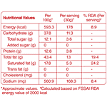 Nutrition per gram/ml: 100g Serving Size: 30g Energy (kcal): 593.3 Carbohydrate (g): 37.8 Total sugar (g): 12.1 Added sugar (g): 0 Protein (g): 12.8 Total fat (g): 43.4 Saturated fat (g): 17.8 Trans fat (g): 0 Cholesterol (mg): 0 Sodium (mg): 560.9