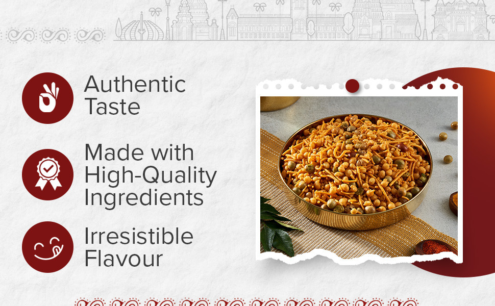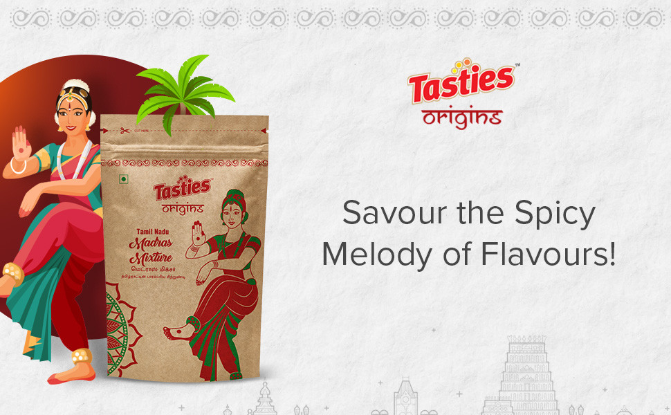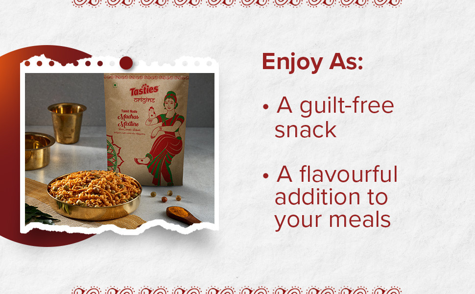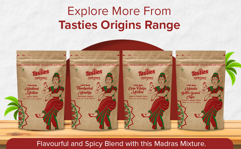 Namkeen - Madras Mixture is the snack you need to satisfy your hunger pangs and cravings and is the perfect munchie to carry with you everywhere. Perfectly blended with fresh and local spices just the way you like it, our snacky treats come with a spicy tadka and are naturally processed with the finest split chickpea flour and blended well with cornflakes, red lentils, and red chilli powder. Our Namkeen - Madras Mixture is a traditional recipe that you can revel in at any time of the day and is sure to make your tastebuds dance. A natural energy booster, our savoury and sweet treat is best accompanied by any beverage of your choice and is ready to eat. Packed with nutrition, Namkeen - Madras Mixture has no added preservatives and no trans-fat, and is the best snack to have in your pantry. Indulge in savoury goodness with our Namkeen - Madras Mixture now! Experiment with the eclectic range of Tasties Origins Namkeen collections on Big Basket from Lahsun Sev, Indori Mixture, and more where tradition meets flavour in local recipes.