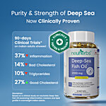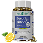 Neuherbs Deep-Sea 2500 mg Lemon Flavour Omega-3 Fish Oil Soft Gels offer a high-strength formula delivering 1486 mg omega-3, including 892 mg EPA and 594 mg DHA per serving. Each capsule provides 10 mg vitamin E (100% RDA) and vitamin D3 200 IU (50% RDA), supporting skin and bone health. Tested for heavy metals and free from cholesterol, preservatives, sugar, sodium, and gluten. With a reflux-free lemon flavour, they ensure better absorption without fishy aftertaste. Since diets often lack sufficient fish, nuts, and leafy greens, supplementing with omega-3 becomes essential.