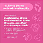 Prebiotic: Fructooligossachrides 100 mg, Probiotics 30 Billion cfus (Contains the following 16 Strains): L. Plantarum L. Acidophilus L. Rhamnosus L. Salivarius L. Gasseri B. infantis B. Bifidum S. Thermophilus L. Fermentum L. Casei L. Reuteri L. Paracasei B. Lactis B. Longum B. Breve S. Boulardii