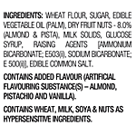 Refined Wheat Flour (Maida), Edible Vegetable Oil (Palm), Sugar, Dry Fruit Nuts- 8% (Almond & Pista), Milk Solids, Glucose Syrup, Raising Agents [(Ammonium Bicarbonate E503(Ii), Sodium Bicarbonate E500(Ii)], Edible Common Salt, Permitted Emulsifier (Soy Lecithin E322). Contains Added Flavour (Artificial Flavouring Substances)- Almond And Pista.