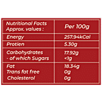 Nutrition per gram/ml: 100g Energy: 257.94kCal Protein: 5.30g Carbohydrates: 17.92g of which Sugars: <1g Fat: 18.34g Trans fat: 0g Cholesterol: 0g