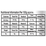 Nutrition per gram/ml: 100g Total Calories: 560.49kcal Total Fat: 39.29g Sodium: 32mg Carbohydrate: 31.10g Dietary Fiber: 7.40g Protein: 20.62g Vitamin-A: 3.10micron Vitamin-C: 0mg Calcium: 58mg Iron: 1mg Mono Sugar: 0g Trans Fat: 0g Saturated Fat: 2.64g Cholesterol: 0mg Unsaturated Fat: 29.17g