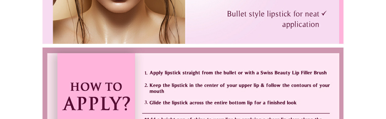 • Apply lipstick straight from the bullet or with a Swiss beauty Lip Filler Brush. lipstick in the center of your upper lip and follow the contours of your mouth.