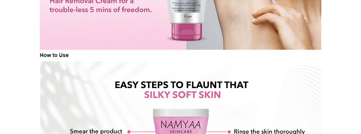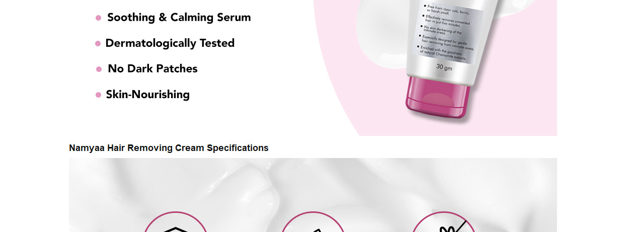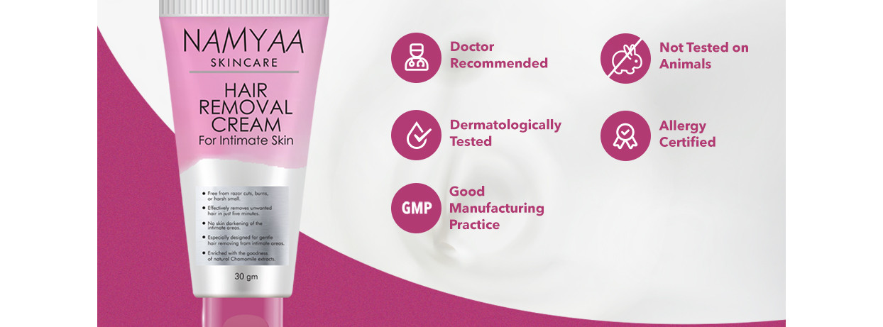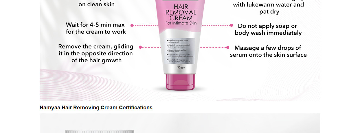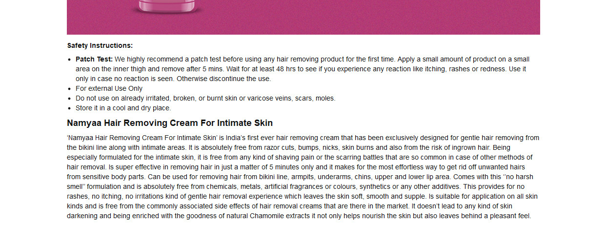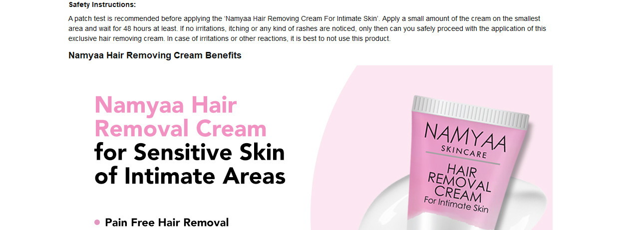 ‘Namyaa Hair Removing Cream For Intimate Skin’ is India’s first-ever hair removal cream that has been exclusively designed for gentle hair removal from the bikini line along with intimate areas. It is absolutely free from razor cuts, bumps, nicks, skin burns and also from the risk of ingrown hair. Being especially formulated for the intimate skin, it is free from any kind of shaving pain or the scarring battles that are so common in the case of other methods of hair removal. Is super effective in removing hair in just a matter of 5 minutes only and it makes for the most effortless way to get rid of unwanted hairs from sensitive body parts. Can be used for removing hair from the bikini line, armpits, underarms, chins, upper and lower lip area. Comes with this ‘’no harsh smell’’ formulation and is absolutely free from chemicals, metals, artificial fragrances or colours, synthetics or any other additives.