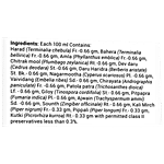 Each 100 ml Contains: Harad (Terminalia chebula) Fr.-6.66 gm, Bahera (Terminalia bellirica) Fr.-6.66 gm, Amla (Phyllanthus emblica) Fr.-6.66 gm, Chitrak mool (plumbago zeylanica) Rt.-6.66 gm, Devdaru (cedrus deodara) St.-6.66 gm Daru (haridra berberis aristate) St. Bk.- 6.66 gm Nagarmootha (cyperus scariosus) Pl. -6.66 gm Vidanga (embelia ribes) Sd.- 6.66 gm, Chirayata (andrographis paniculate) Fr. -6.66 gm, Patola patra (trichosanthes dioica) Lf. - 6.66 gm, Giloy (tinospora cordifolia) St.- 6.66 gm, Pitpapra (fumaria vaillantii) Pl.- 6.66 gm, Ajwain (trachyspermum ammi) Sd. -6.66 gm, Sounth (zingiber officinale) Rt.- 6.66 gm, Kali Mirch (piper nigrum) Fr.- 6.66 gm, Pippali (piper longum) Fr.- 6.66 gm, Kutki (Picrorhiza kurroa) Rt.- 6.66 gm with permitted class II preservatives less than 0.3%.