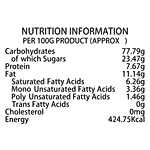 Nutrition_Per: 100g Serving_Size: Carbohydrates: 77.79g Of Which Sugars: 23.47g Protein: 7.67g Fat: 11.14g Saturated Fatty Acids: 6.26g Mono Unsaturated Fatty Acids: 3.36g Poly Unsaturated Fatty Acids: 1.46g Trans Fatty Acids: 0g Cholesterol: 0mg Energy: 424.75kcal
